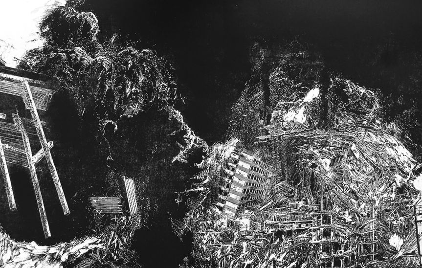 Avec صابون حلب, Camille Dufour évoque le siège et la destruction de la ville d’Alep à travers une performance réalisée dans une ancienne savonnerie. Les matrices, encrées une seule fois, sont imprimées à la main sous la pression d’un savon d’Alep appliqué au dos du papier. Suspendues par un seul point, les feuilles s’enroulent en cônes, tel un hommage aux victimes, dévoilant leurs deux faces. Sur la première, l’effacement progressif du motif gravé évoque la destruction de la ville ; tandis qu’au dos, les traces de savon dessinent une cicatrice, un impossible oubli. L’acte d’impression devient alors un geste de soin, onguent posé sur une plaie, rappelant une ablution funéraire.